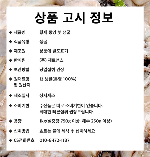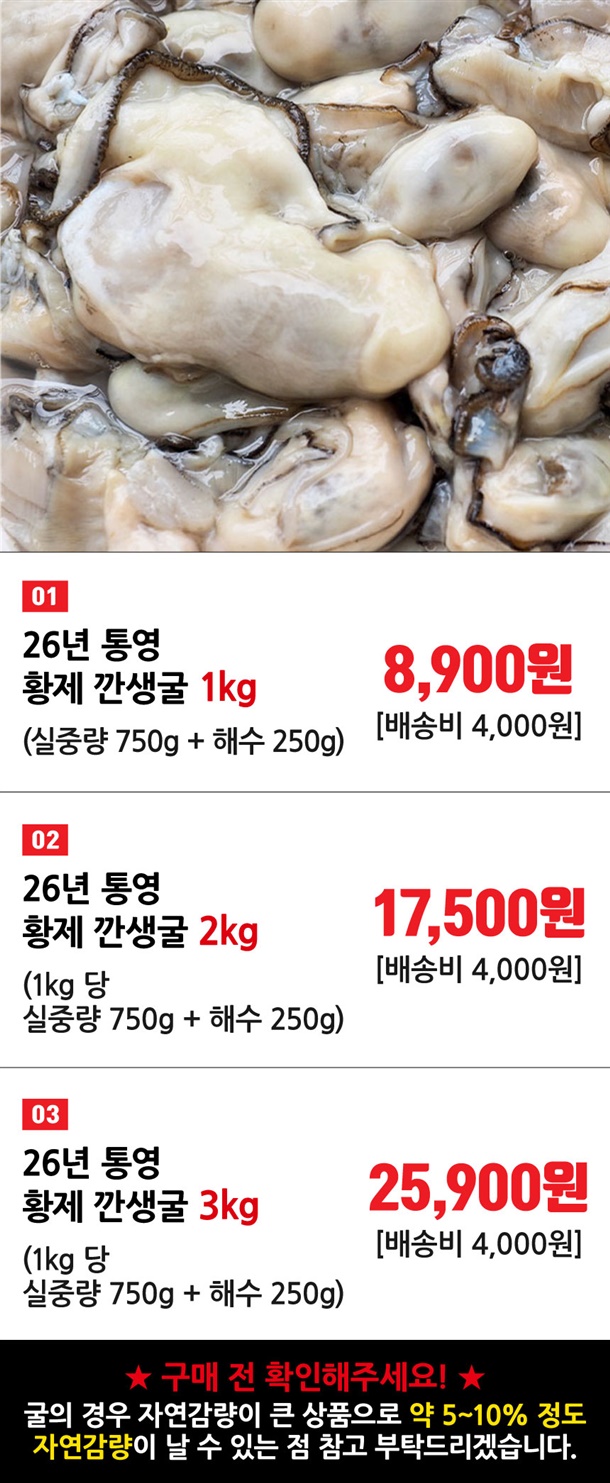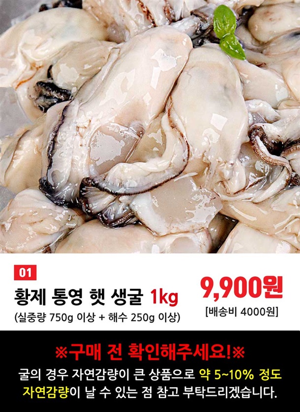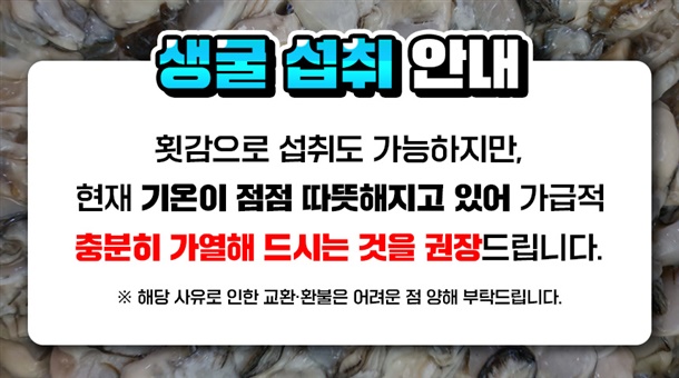 ※ 꼭! 확인해주세요! ※ 1kg 기준 실중량750g + 해수250g ※ 굴의 경우 자연감량이 큰 상품으로 약 5-10%정도 자연감량이 날수 있습니다. ※ (해수 제외) 굴의 무게를 재실 때 씻어서 무게를 재시면 안됩니다. 씻을수록 감량이 더욱 나기에 받은 상태 그대로 확인 해 주세요. |