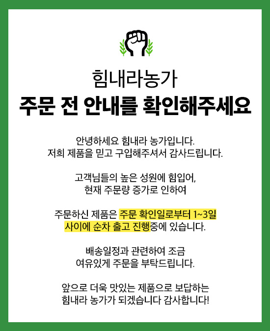 · 배송 메시지에 기재된 내용은 택배사에 전달되는 내용으로 발송처 및 힘내라농가에 요청하실 사항은 주문 직후 상담톡을 통해 문의 부탁드립니다.