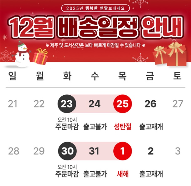 · 상품은 고지된 날짜보다 빠르게 배송될 수 있으며, 지정일 배송은 불가합니다. 이로 인한 환불/교환은 어렵습니다.