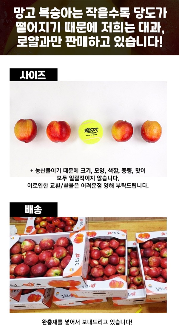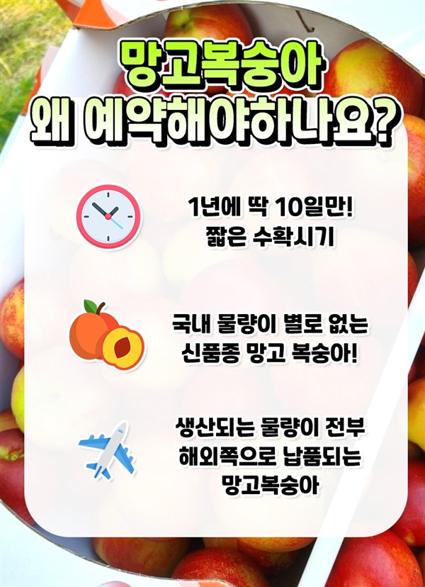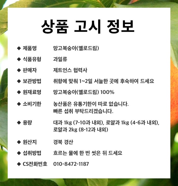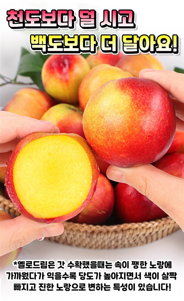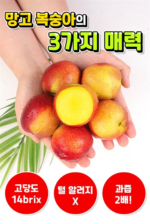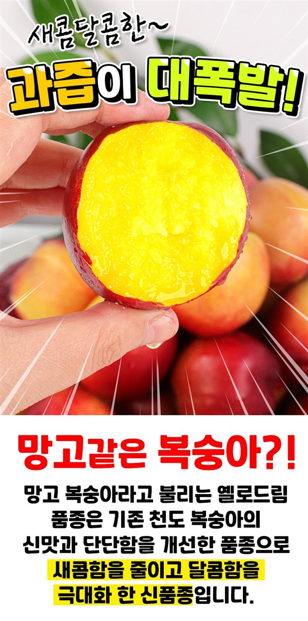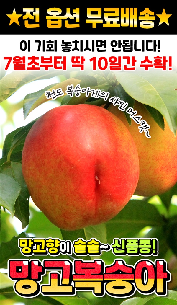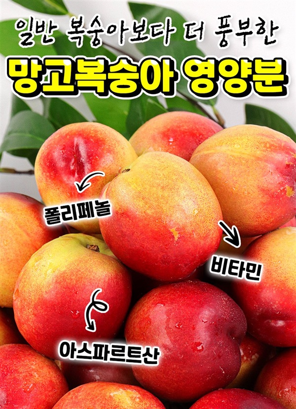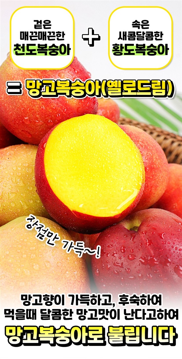 달콤한 망고의 향과 망고맛이 난다하여 망고복숭아라고 불리며 겉은 천도복숭아, 속은 황도복숭아의 장점만 쏙쏙. 천도복숭아 새콤함은 줄이고 달콤함을 극대화환 신품종으로 국내에서 재배하는 곳 몇 없으며 딱 보름 수확으로 지금 아니면 없을 기회. ···<구매하러가기>