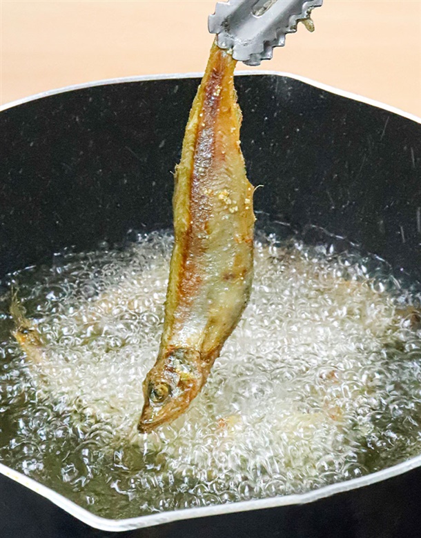 튀김가루를 묻힌 시샤모를 넣고 튀겨주면~