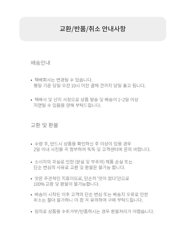 · 교환/반품 신청은 배송완료 후 신선식품 24시간 / 가공식품 3일 이내에 가능합니다.