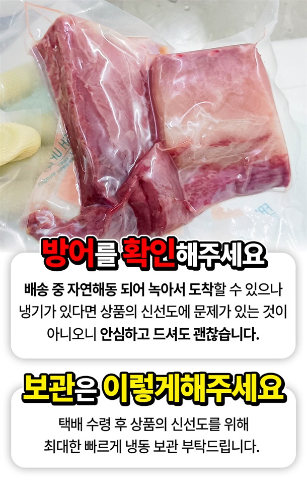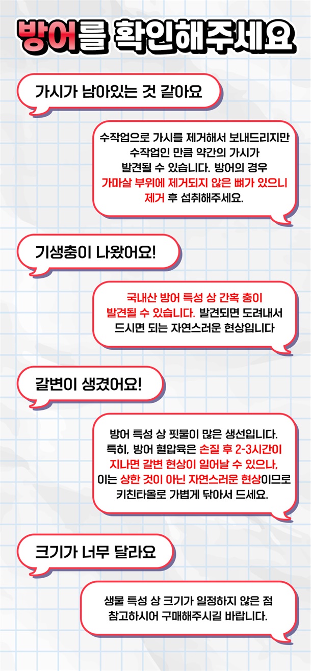 간혹 자연산 방어 내에 존재하는 기생충이 있어 빨간색 실모양이나 핏자국이 있을 수 있으니 해당 부분 제거 후 섭취해주세요.