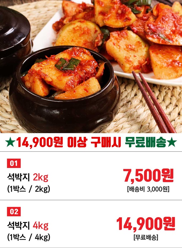 두번 다시 없을 가격 ! 기본 오리지널 ! = 석박지 = 2kg 7,500원 ! !! 공구특가 !! 4kg 14,900원! (무료배송) |