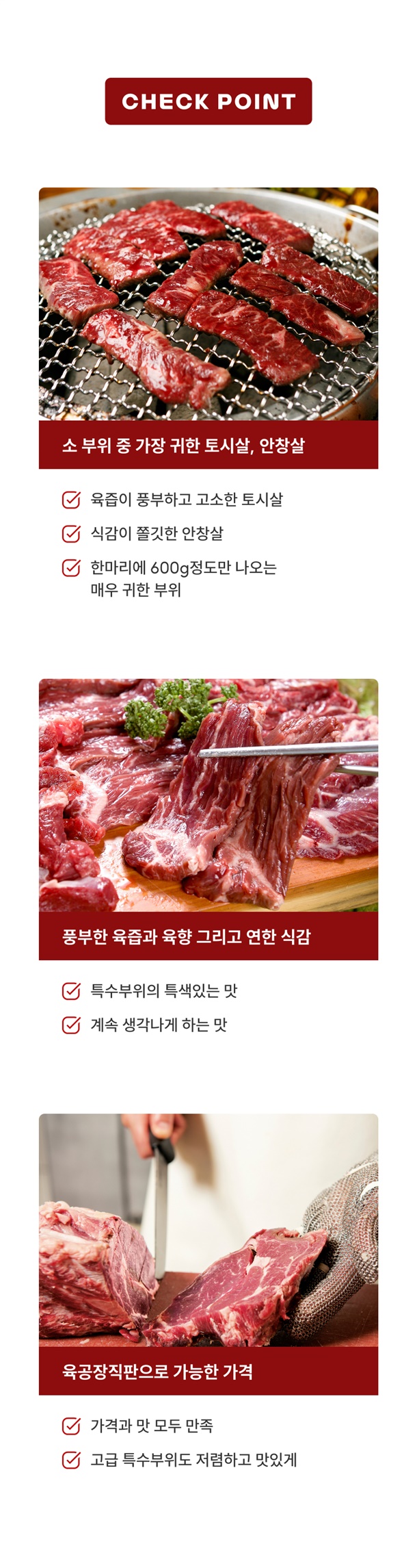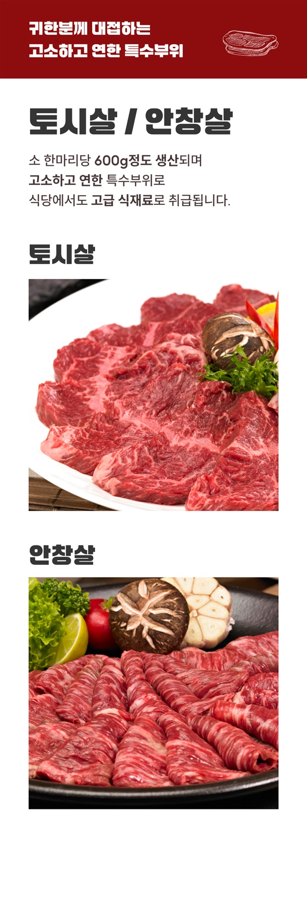 소 한마리에서 500~600g 밖에 안나올 정도로 귀한 특수부위라 오프라인 매장에서 150g당 만원대 중후반에 판매하고 있을 정도로 값비싼 부위입니다!